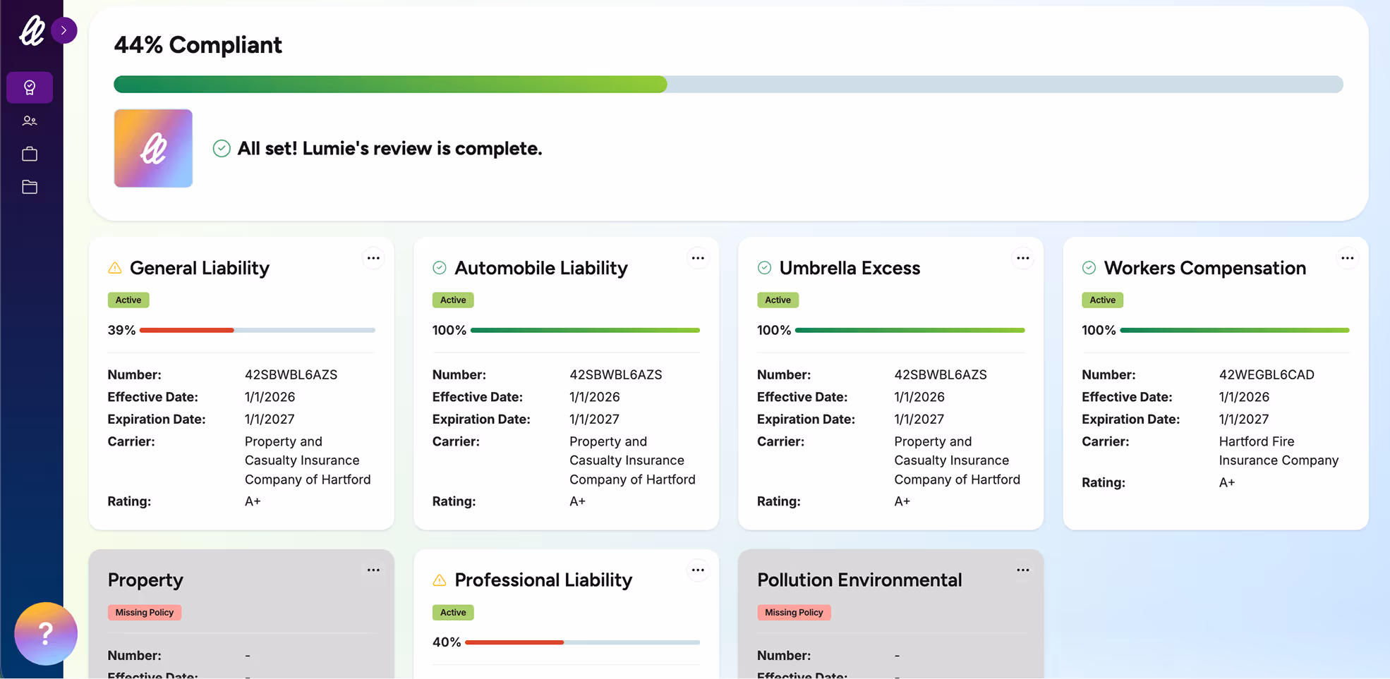 See compliance status and policy cards, with expiration dates