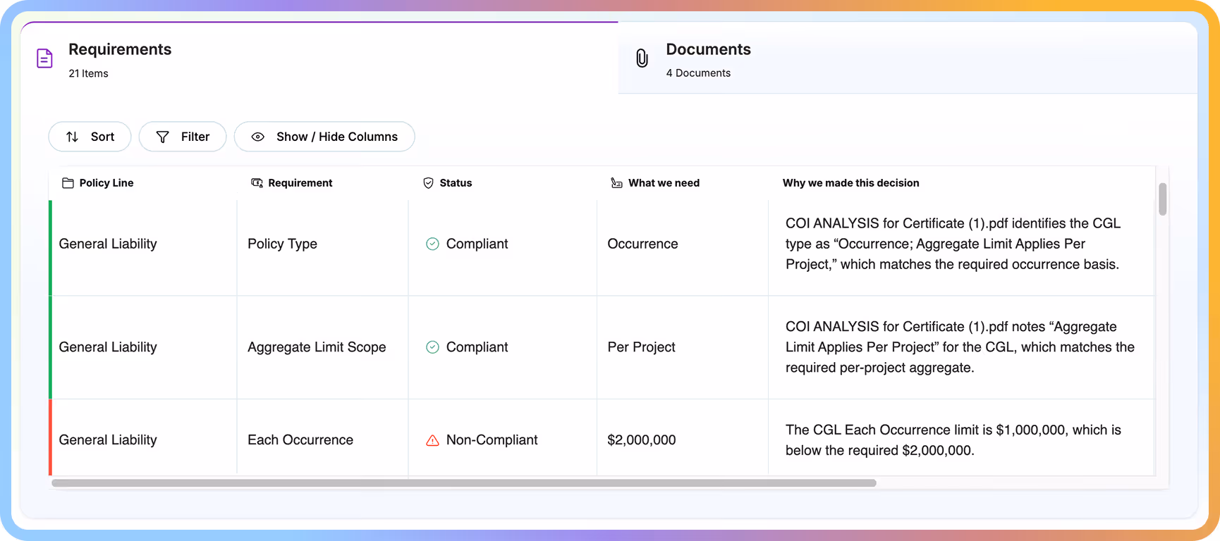 - Our AI reads third-party partner COIs, endorsements, and compare them to insurance requirements
