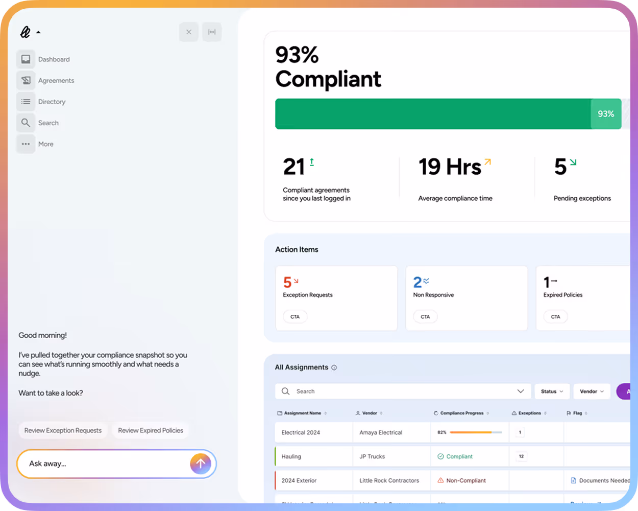 - Coverage gaps flagged in real time, before a non-compliant contractor steps on-site
